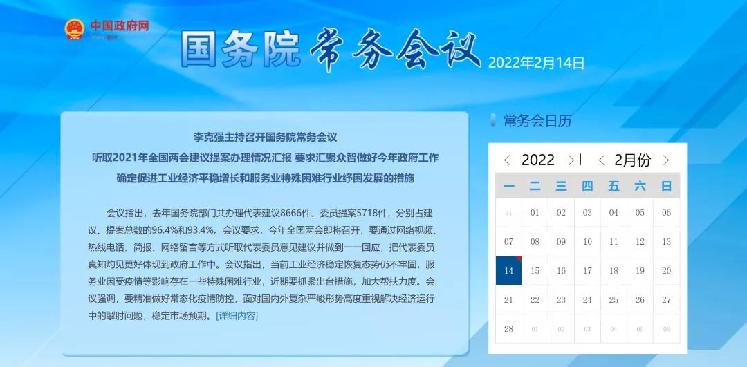 据新华社2月15日消息,国务院总理李克强2月14日主持召开国务院常务会议,听取2021年全国两会建议提案办理情况汇报,要求汇聚众智做好今年政府工作;确定促进工业经济平稳增长和服务业特殊困难行业纾困发展的措施。其中包括:针对餐饮、零售、旅游、交通客运等特殊困难行业,在阶段性税收减免、部分社保费缓缴等方面加大支持力度,促进稳就业和消费恢复。2022年免征公交和长途客运、轮客渡、出租车等公共交通运输服务增值税。继续按80%比例暂退旅游服务质量保证金。对承租国有房屋的服务业小微企业和个体工商户,今年被列为疫情中高风险地区的减免6个月租金,其他地区减免3个月。各地可对承租非国有房屋的服务业小微企业和个体工商户给予适当帮扶;对减免租金的房屋业主,按规定减免今年房产税、城镇土地使用税。